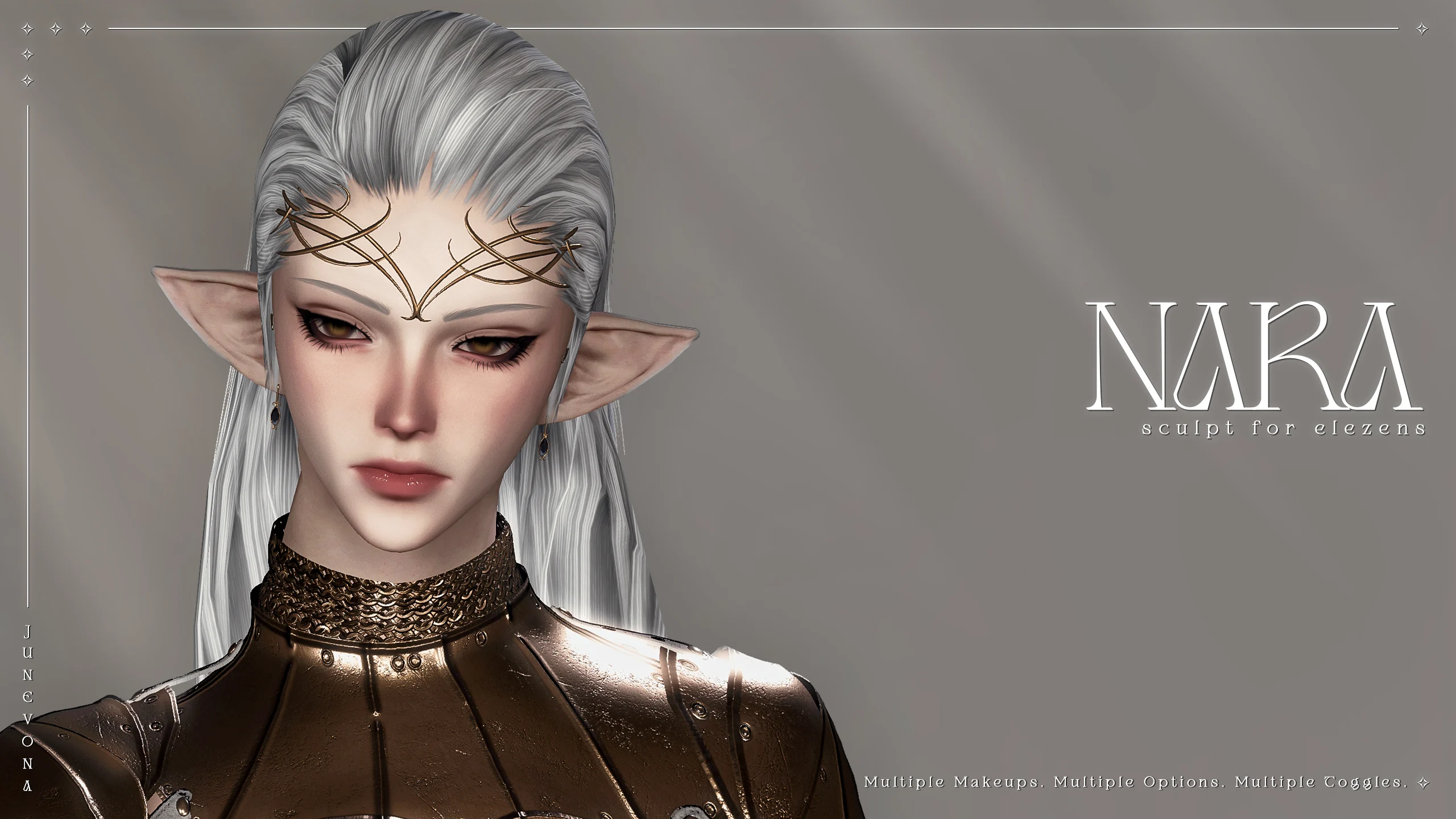 There are also two eye heterocromia options, two makeup options,full lash and brow retexture, 2 face toggles (a circlet and earrings – you can toggle them in glamourer or the aesthetician), two accessory metal color options, six earring gemstone options, a custom normal and multi map, custom eye retexture, custom teeth and tongue (both poseable), and five lash color options!