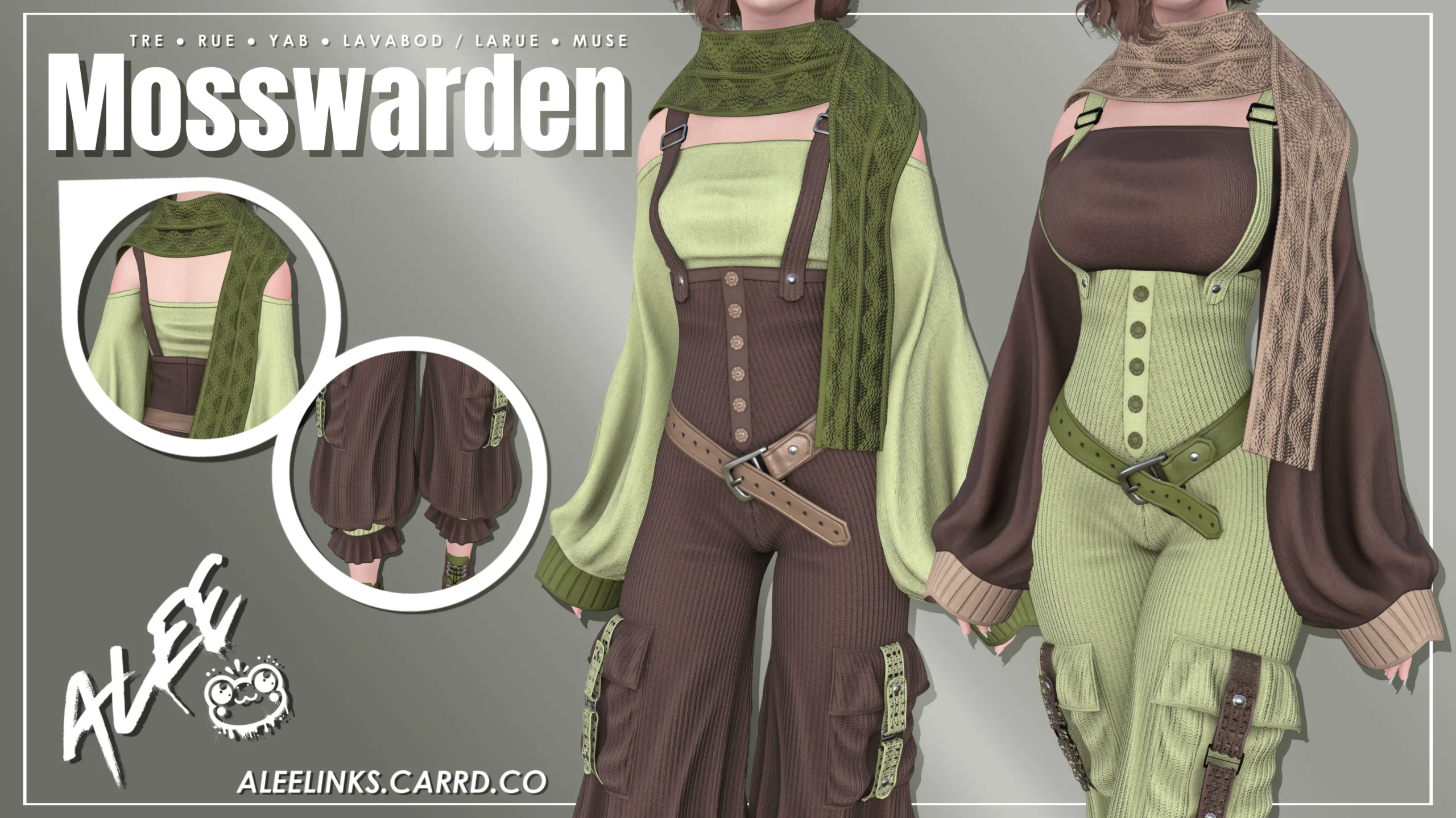 A one-piece outfit featuring an off-shoulder top with giant bell sleeves, a belted knit bell-bottom dungaree, and a knit scarf. Perfect for gatherers imho.