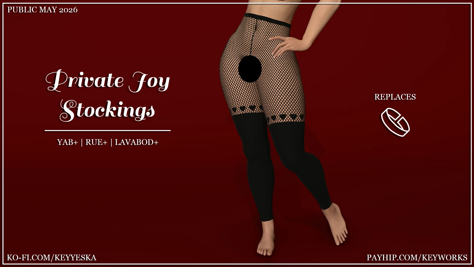 These stockings come in three different patterns, are available for all leg sizes for each body variant (YAB+ Yanilla is there; it was a late addition), and is assigned to bracelets for mixing and matching. All variants of the stockings should accommodate standard and buff torsos; Rue+ and LaRue+ do not have buff variants as the stockings are already adjusted for them.