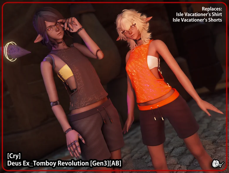 Tomboy themed shorts and tub/shirt combo with patterns themed after the Deus Ex series of games.