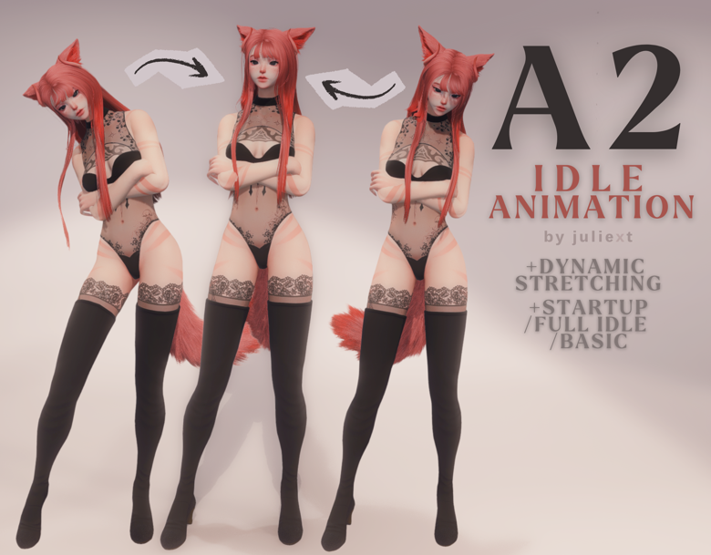 A2’s idle animation from punishing gray raven <3 𝗠𝗮𝗱𝗲 𝗙𝗼𝗿 All Talls (no Lala, MHroth, MRoe) 𝗥𝗲𝗽𝗹𝗮𝗰𝗲𝘀: Standing /cpose2 Animation made for tall females, but I spent some time making adjustments to work with Males & FRoe/FHroth (some minor clipping) – Startup: dynamic (full) or none – Idle: dynamic (full) or basic – Adjustment option for bigger arms – Ear toggle 𝗜𝗩𝗖𝗦 𝗥𝗲𝗾𝘂𝗶𝗿𝗲𝗱 [x] No weapon animation (default at t-pose) [x] May have some clipping with skirts