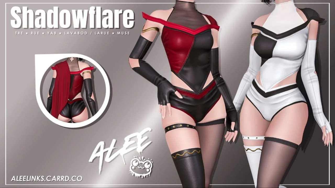 Includes a two-tone top with a cape, long leather gloves, buttshorts with stockings, and asymmetric boots.